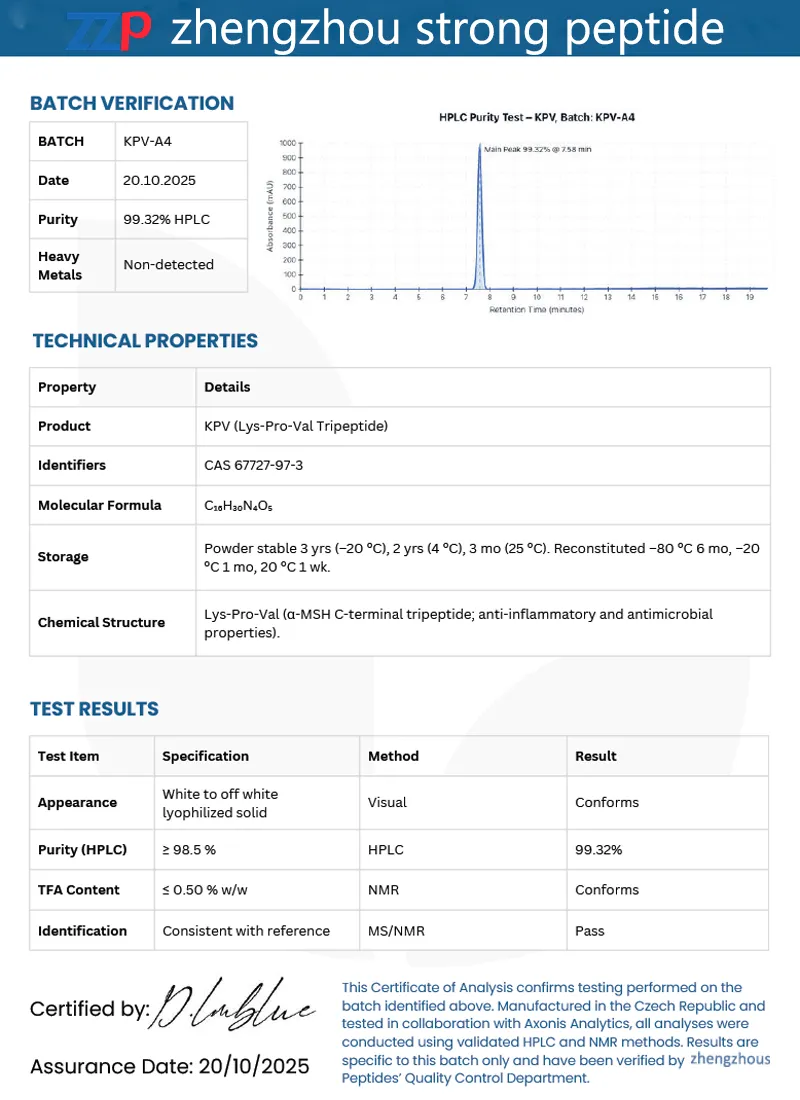 Our peptides, including KPV, are tested for purity, potency, and compliance before shipping to ensure consistency and reliability in every vial.